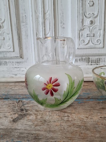 Jordbærstel bestående af skål og kande med håndmalet emalje dekoration samt forgyldt kant no. 660/355 Fyens Glasværk ca. år 1901. |