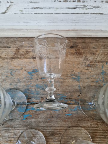 Set of 5 antique wine glasses decorated with bunches of grapes and vine leaves. The height varies between 10.5 - 11.5 cm.