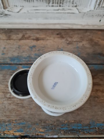 Royal Copenhagen Apotekerkrukke i hvidt porcelæn med sort skrift Produceret mellem 1850-98 Højde 14,5 cm. Diameter 8 cm.
