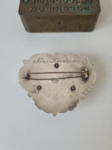 Stor skønvirkebroche i sølv med rav Stemplet: 826s - O.Friis - Sølvsmed i Kolding fra 1910-1937 Mål 5,5 x 6,5 cm. Fremstår med gravering på bagsiden