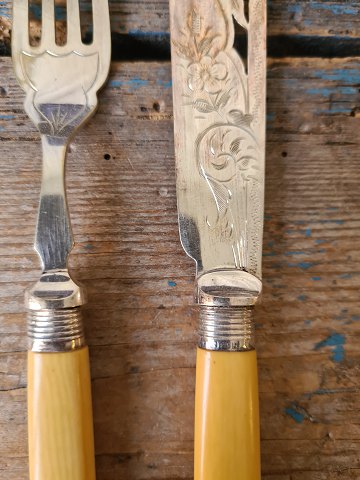 English silver-plated fish cutlery with bone handle for six people in original spoon.