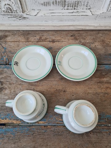 Par franske café brûlot kopper i kraftigt jern porcelæn dekoreret med grønne striber samt teksten Café Prévost