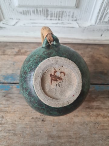 Arne Bang kande med bast håndtag. Kanden har en utrolig smuk grøn glasur. Signeret AB - 151 Højde 17 cm. Fremstår fejlfri