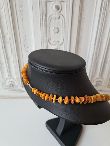 Lang vintage halskæde med pollerede ravstykker i forløb Længde 64 cm. Ravstykkerne variere i størrelse fra 7,6 mm. til 17,8 mm.
