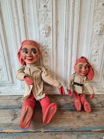 Par gamle fine butiks nisser, deres hoveder er fremstillet i håndmalet keramik, arme og ben kan bøjes.