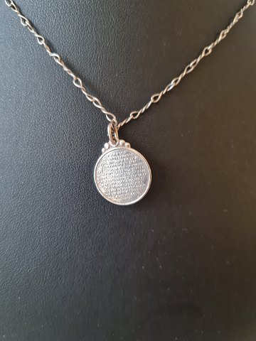 Halskæde i sølv med vedhæng dekoreret med trekløver på den ene side og Fadervor på den anden side