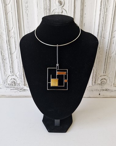 Bent Knudsen halsring i sterling sølv med grafik vedhæng prydet med rav