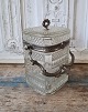 Beautiful old biscuit bucket in pressed glass with pewter mounting Measurements 12 x 12 cm. Height 19.5 cm.
