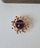 Vintage brooch in 14 kt gold with large amethyst surrounded by small pearls. Stamped 585 Diameter 3 cm. Diameter of amethyst 15 mm.