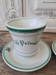 Pair of French café brűlot cups in strong iron porcelain decorated with green stripes and the text Café Prévost. |