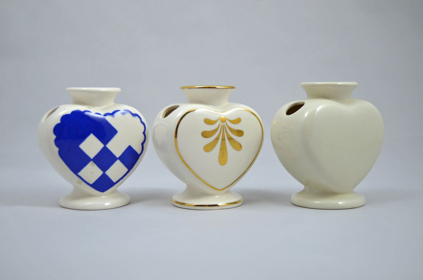 Tre charmerende hjerteformede stager til kertelys fra Royal Copenhagen. Stagerne kan også anvendes som vaser. Alle stager måler 8 cm i højden med en bredde på 7,5 cm.