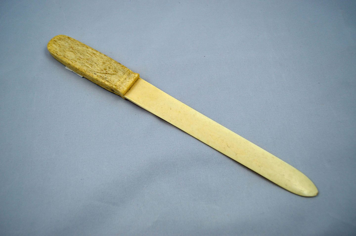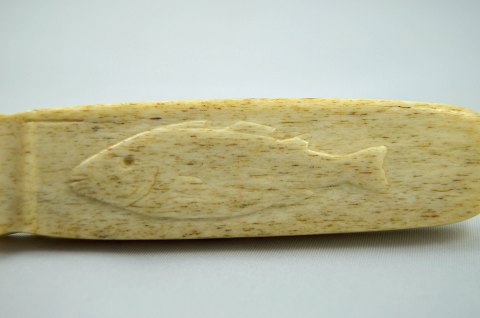 Brevåbner udskåret i hvalrostand ben med et dekorativt skaft af ben. Dekoration på skaftet er en fisk. Længde: 26 cm.