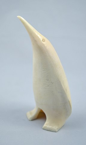 Figur af en pingvin udskåret af stødtanden fra en hvalros. Pingvinen er meget flot forarbejdet og i flot stand. Højde: 11 cm. Pris: 2000 kr. Varenr.: 204594