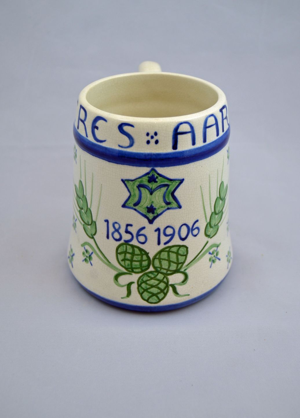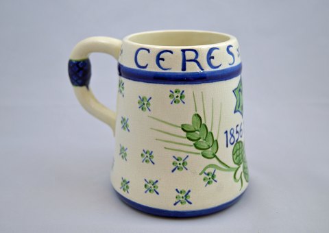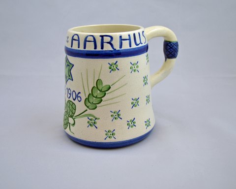 Jubilæumskrus for Ceres Aarhus, år 1856-1906 fra Aluminia nr. 503/456, arkivfoto koppen har nogle små fejl