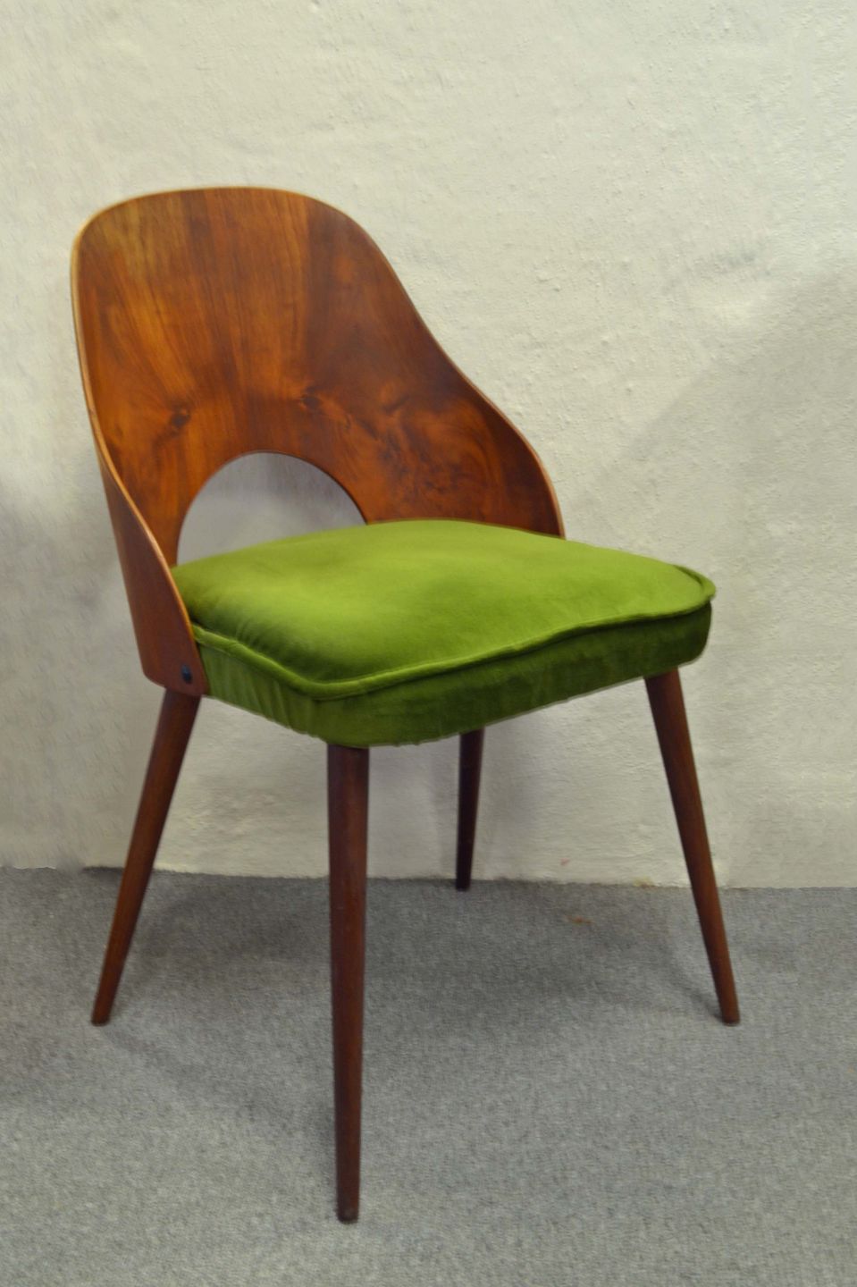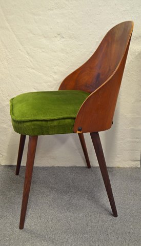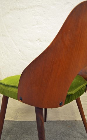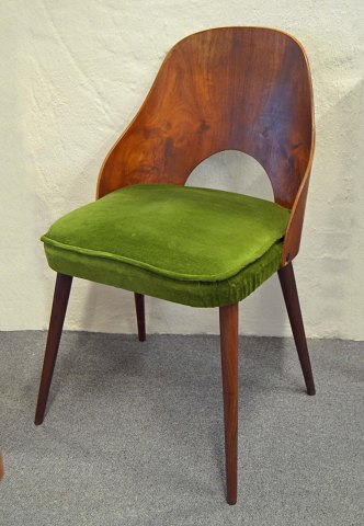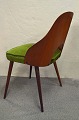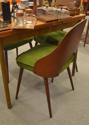 Stole af teaktræ med formbøjet ryg. Stolene har et godt polstret sæde beklædt med grønt velour. De er velholdte med enkelte overfladiske brugsspor på ryglænet. Teaktræsstolene har en god sidde komfort. Højde: 79 cm. Bredde: 45 cm. Dybde: 43 cm. Sædehøjde: 44 cm. Pris: 750 kr. pr. stk.
