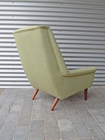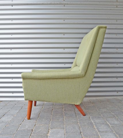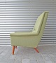 Lænestol betrukket med stof i en fin støvgrøn nuance med teakben.