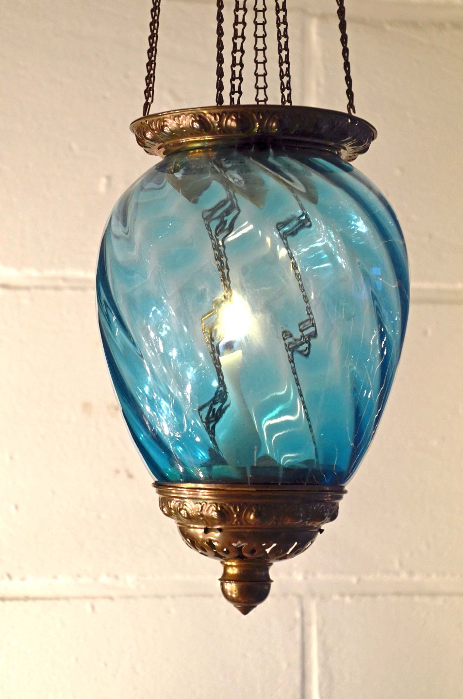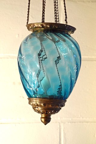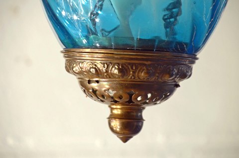 Den består af blåt facetteret glas, som er monteret på forgyldt messingblik. Den fremstår meget velholdt med intakt glas.