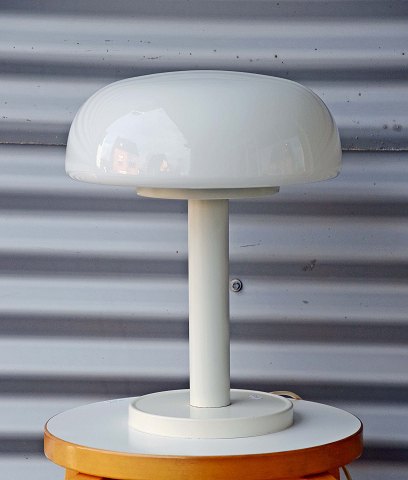 Bordlampe P 76 fra Abo, Randers. Lampen har en hvid glasskærm og hvidlakeret fod. Lampen er i meget pæn stand. H: 38 cm. Ø: 30 cm.