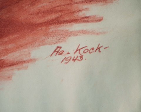 Indrammet maleri af Aa. Koch fra 1943 med motiv af kvinde ved strand. Tegningen er udført med rødt oliekridt. Den er i meget pæn stand.