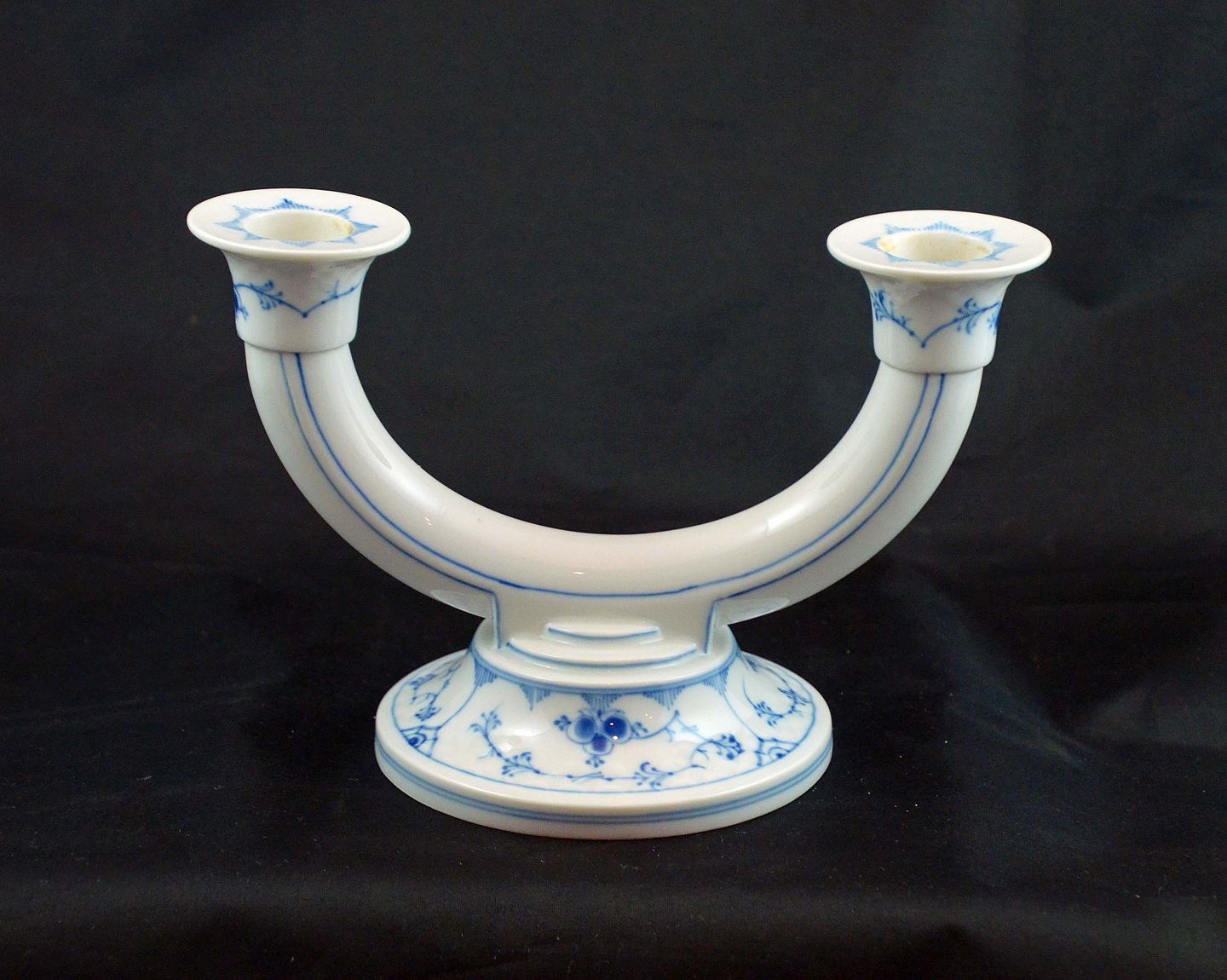 2 stk.To armet lysestager (nr. 236) i musselmalet; blåmalet skelform fra B&G. Stagerne er 2. sort. og i meget pæn stand. Lysestagerne er produceret i perioden 1948-1952. H: 13,5 cm. B: 20,5 cm. Prisen er pr. stk.