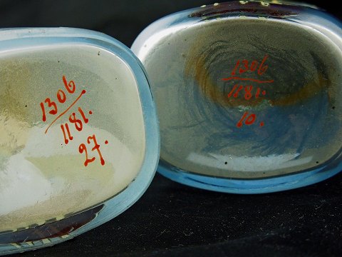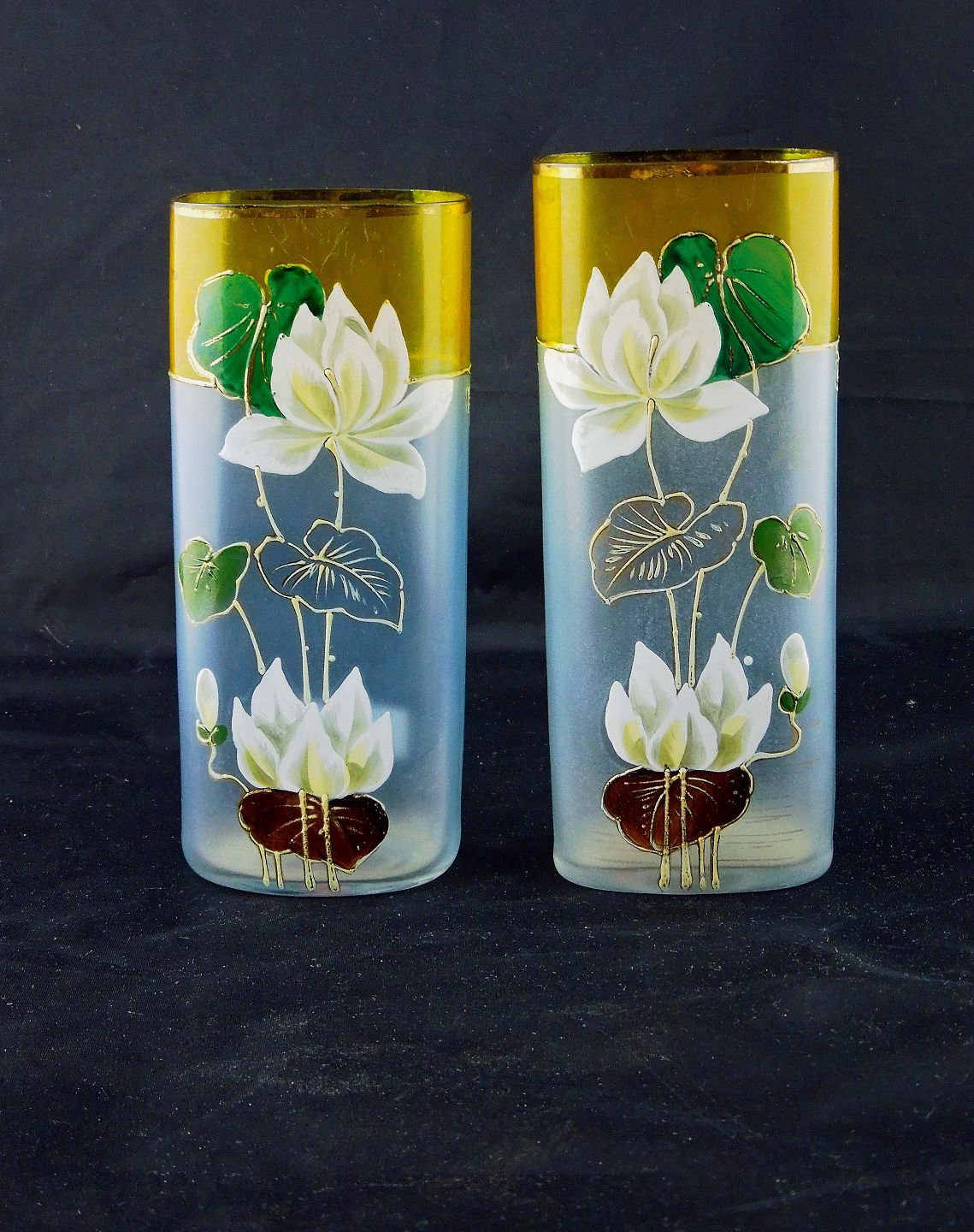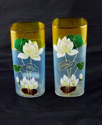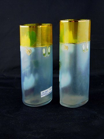 et sæt malede glasvaser formentligt af H.a. Brendekilde. Vaserne er i meget pæn stand. H: 17 cm og 16,5 cm. L: 7 cm. B: 5 cm.