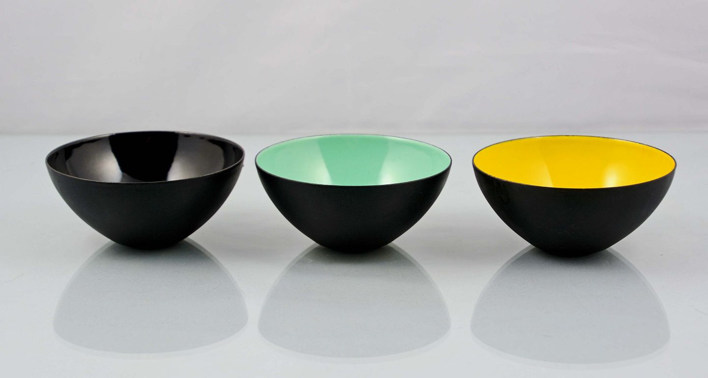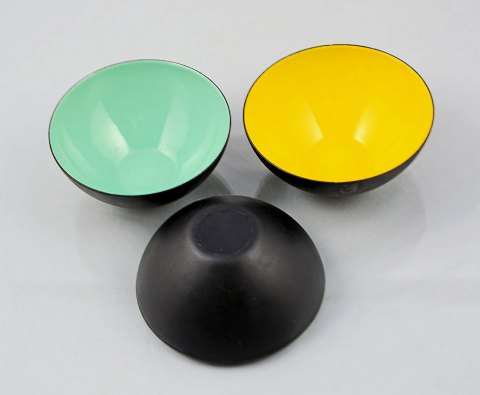 Små krenit skåle i farverne sort, blågrøn og gul. Skålene er i meget pæn stand. H: 4 cm. Ø: 9 cm.