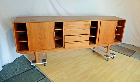 Oman Junior skænk i teaktræ med 4 skydelåger og 5 skuffer. Skænken er i pæn stand. H. 80 cm. L. 220 cm. D. 47 cm.