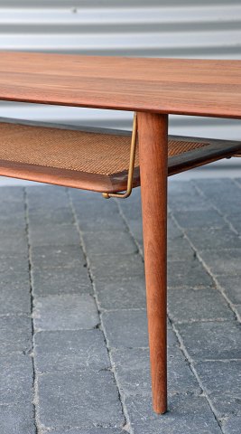 Sofabord i massiv teaktræ med underhylde i teak og flet designet af Peter Hvidt & Orla Mølgaard. Bordet er i meget pæn stand med intakt flet. H. 50 cm. L. 152 cm. B. 50 cm.