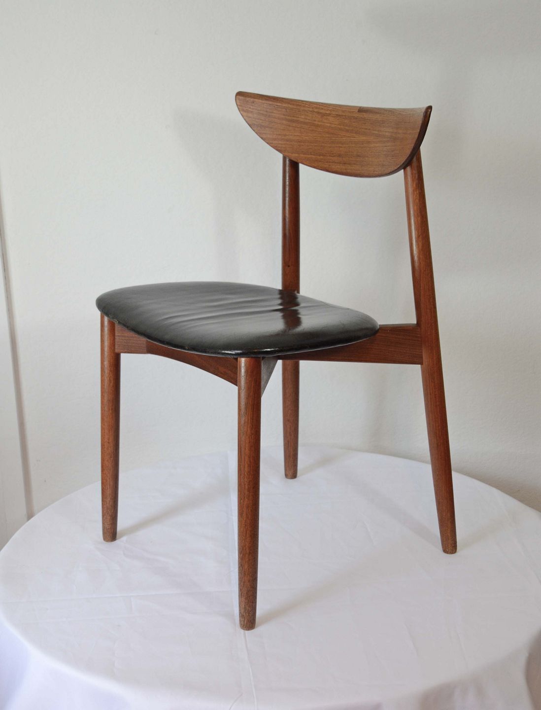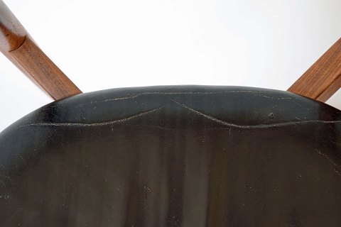 Spisebordsstol design Harry Østergaard. Produceret af Randers Møbelfabrik. Stel i teak med læderbetrukket sæde. Sædet fremstår med brugspatina. Pæn stand.