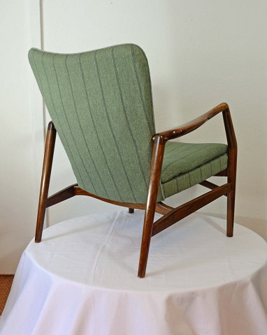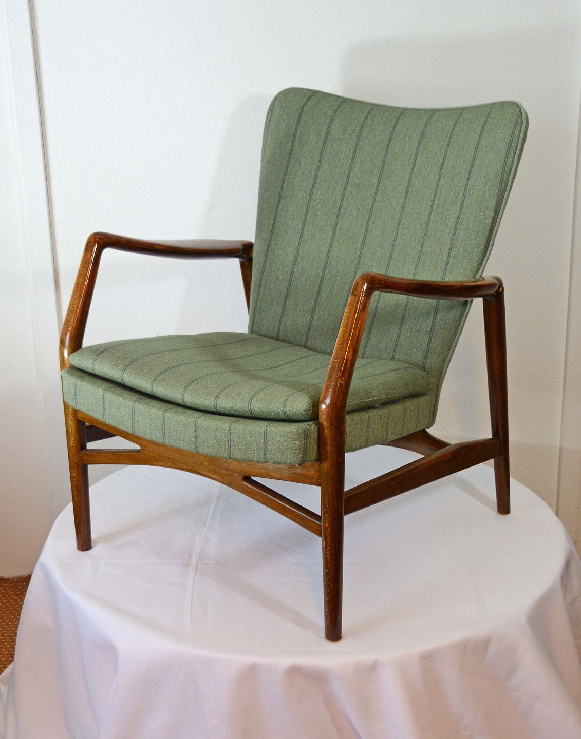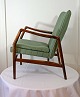 Lænestol model 215 design Kurt Olsen. Produceret på Slagelse møbelfabrik november 1954. Stel af egetræ. Betrukket med møbelstof. Brugsspor ved armlæn. Pæn stand.