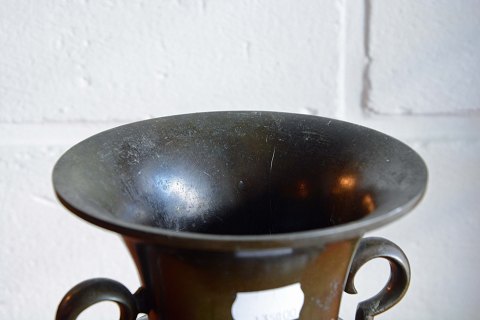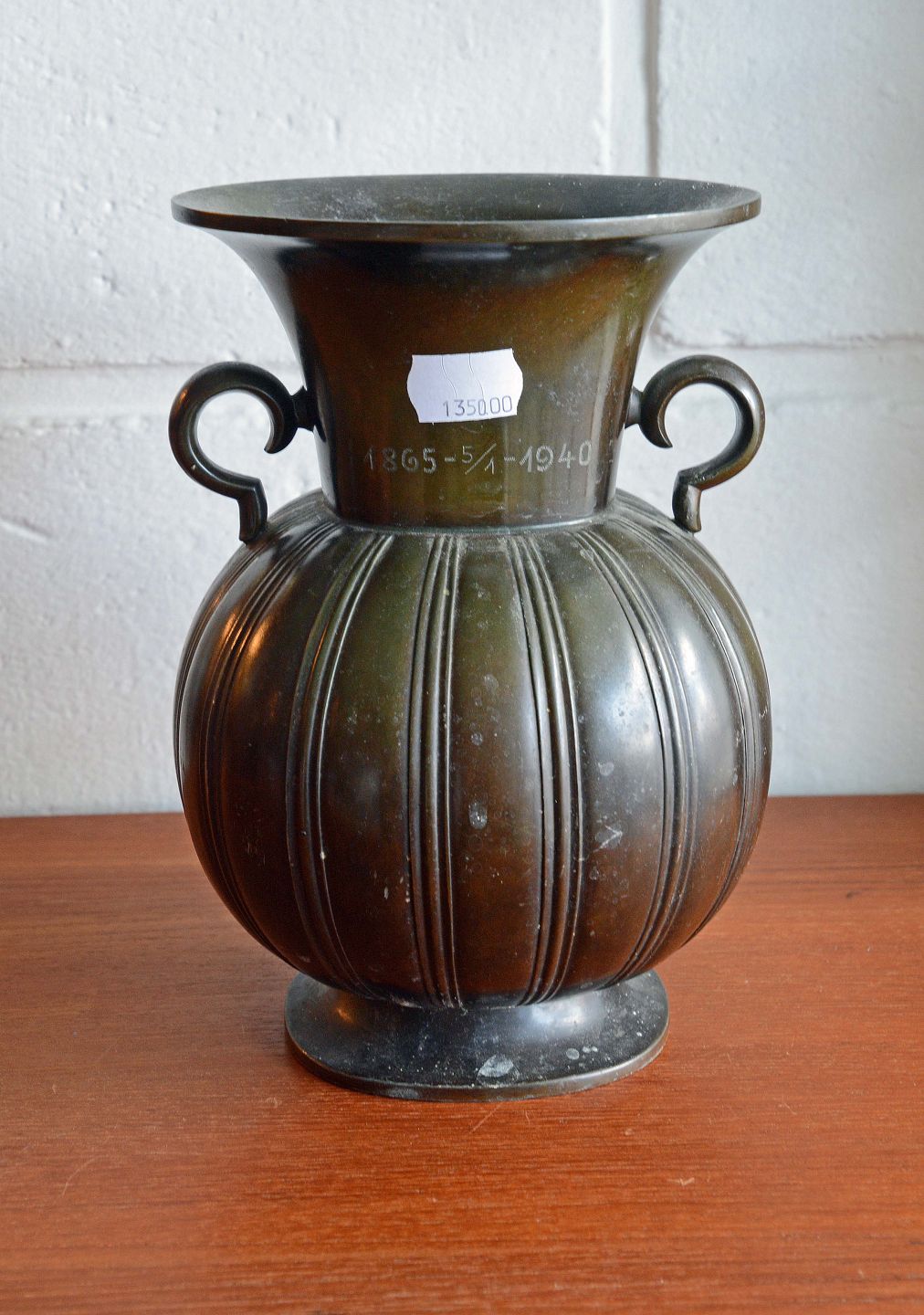 Vase i diskometal af Just Andersen. Signeret "Just nr. 1925". Indgraveret "1865-5/1-1940".