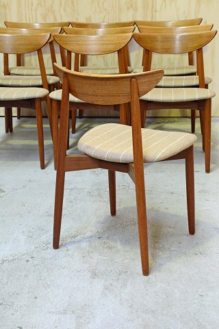 10 stk. Harry Østergaard stole i teaktræ med stofbetrukket sæde. En lille fejl ved ryglænet på en enkelt stol. Pæn stand.