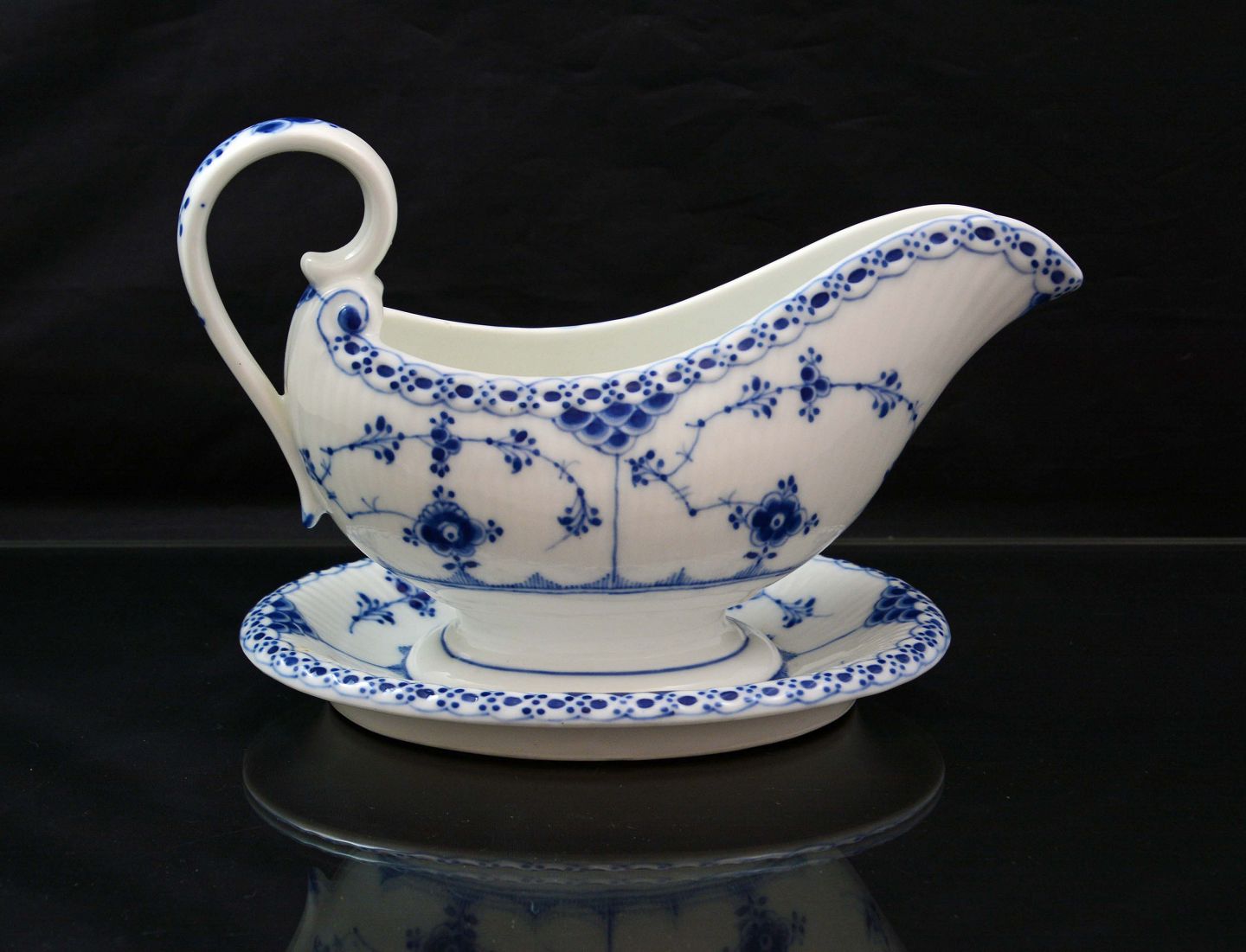 Saucekande (nr. 1/583) i halvblonde musselmalet fra Royal Copenhagen. 1. sort. Intakt og i meget pæn stand.