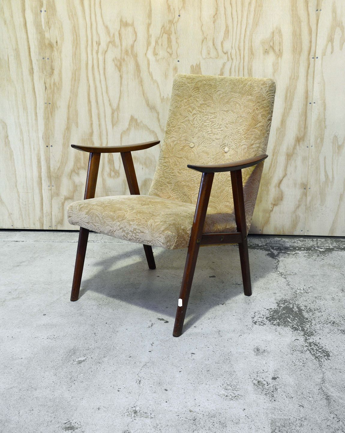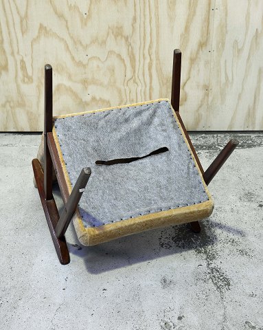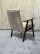 Armstol i teak med stofbetrukket sæde. Brugsspor på ben og armlæn. Intakt betræk.