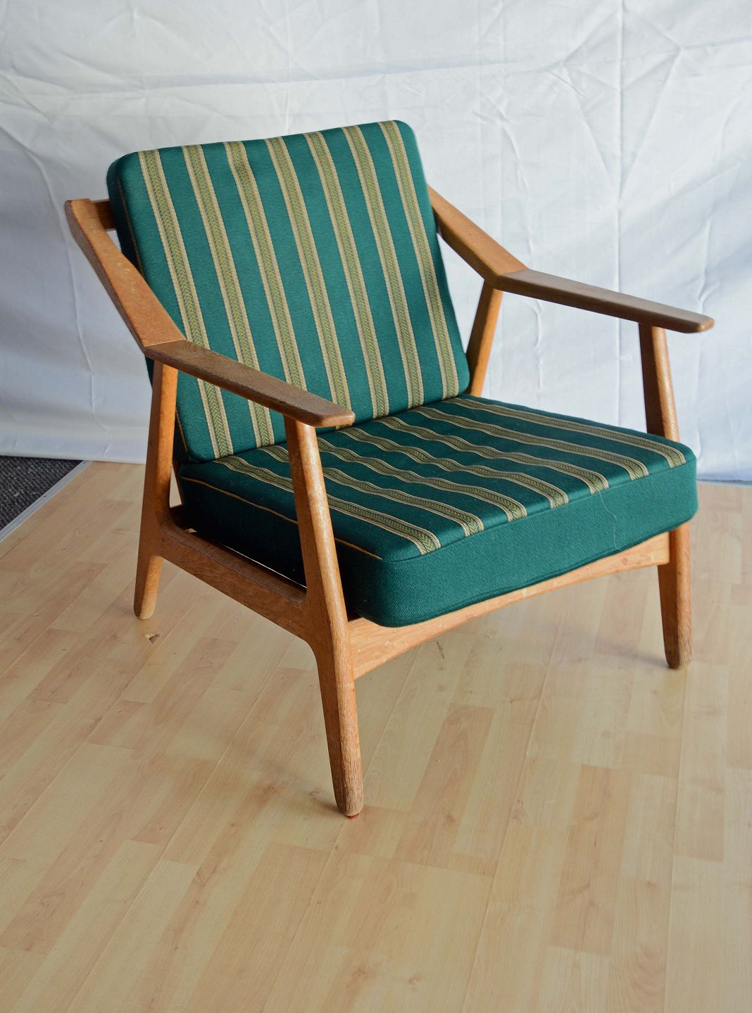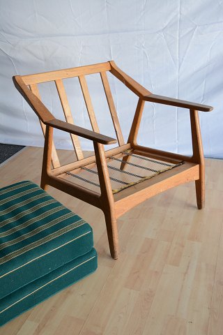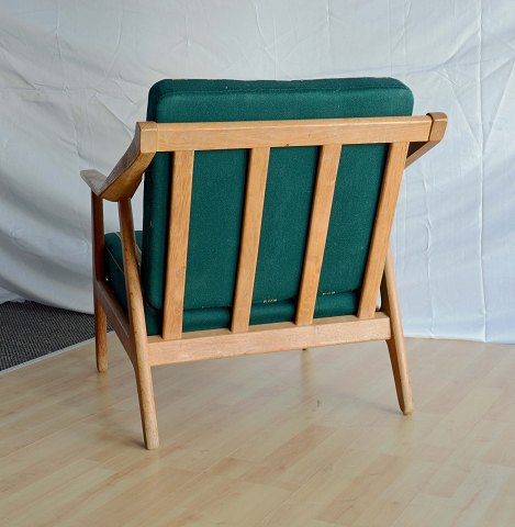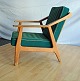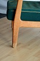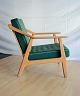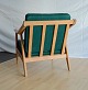 Tre styk lænestole med stofbeklædte hynder designet af H. Brockmann-Petersen. Intakte. Enkelte brugsspor på armlæn og sæder.