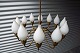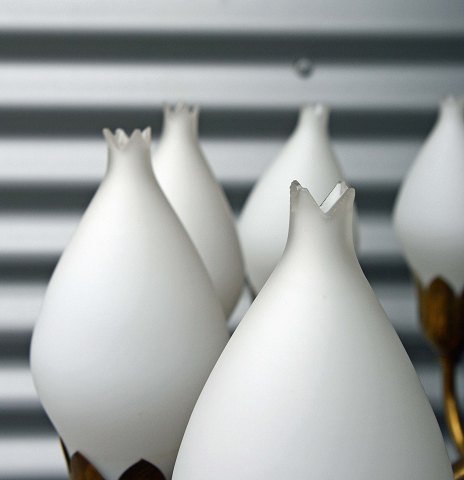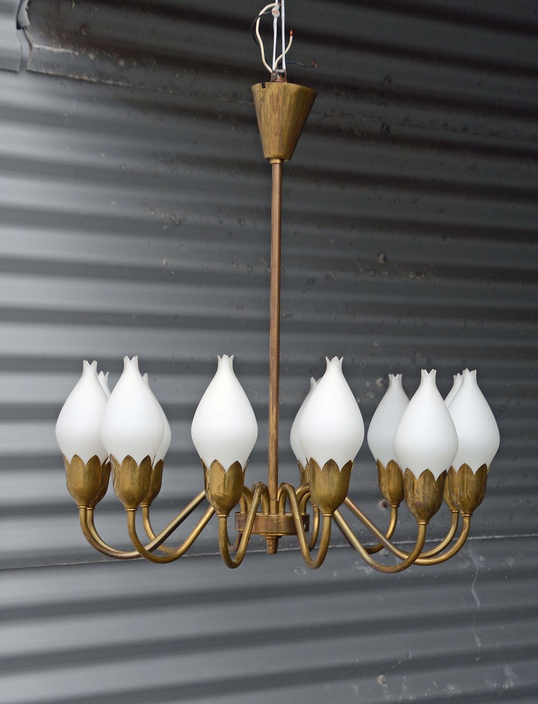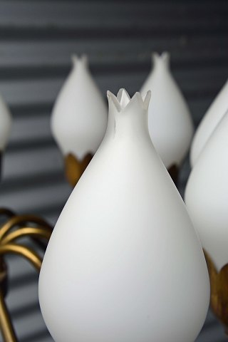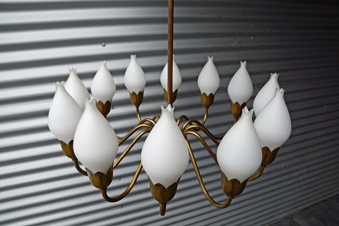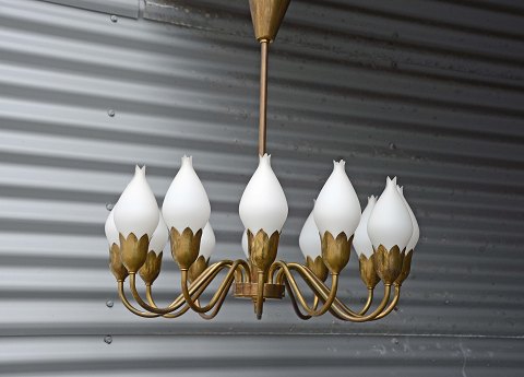 Løglampe lysekrone fra Fog og Mørup i messing med tolv arme med løgformede opalhvide glasskærme. Intakte glasskærme med en mindre fejl på en af skærmene.