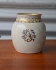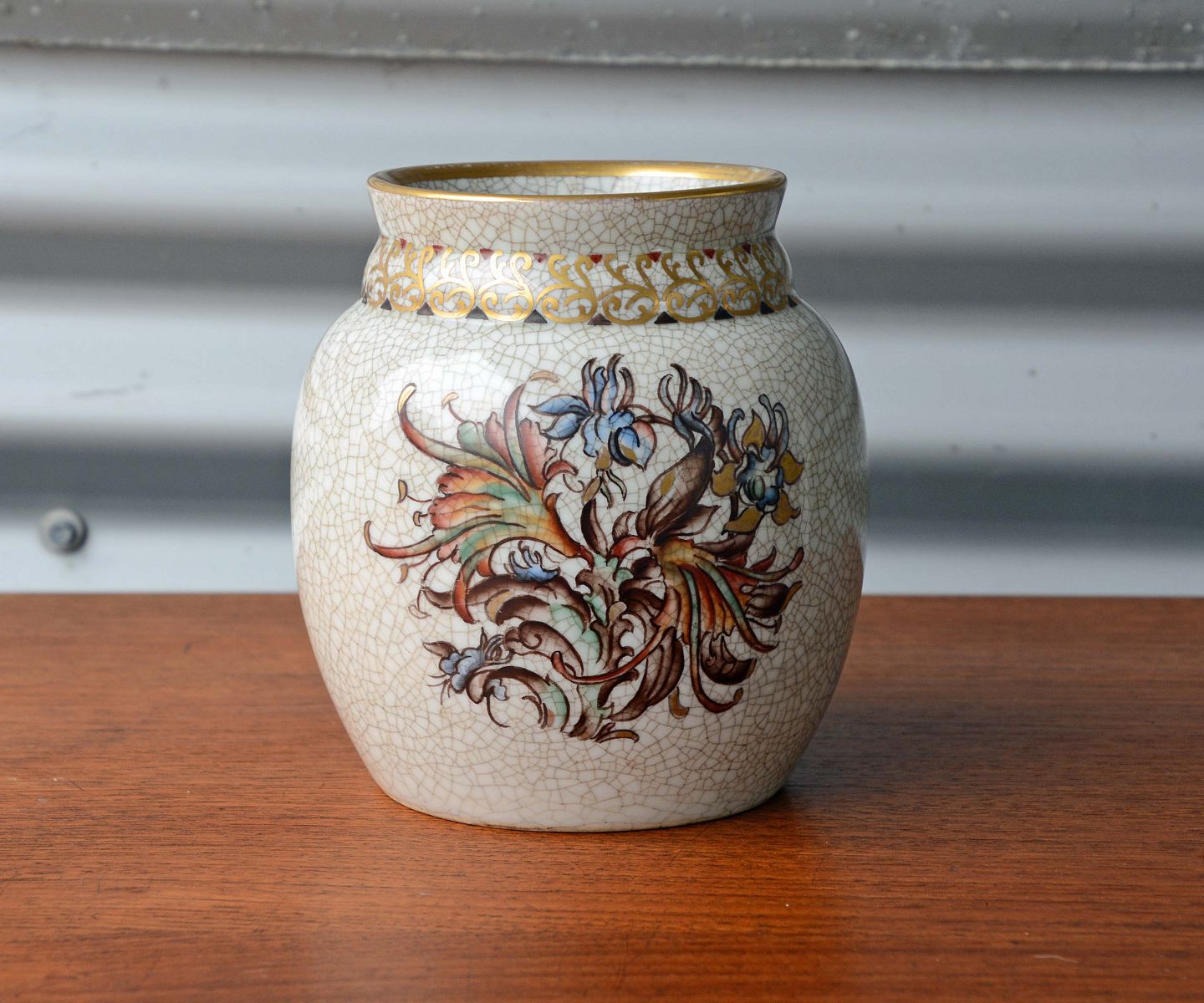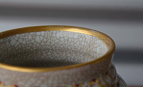 Vase i krakkeleret porcelæn med blomstermotiv og gylden kant.
