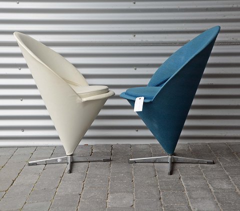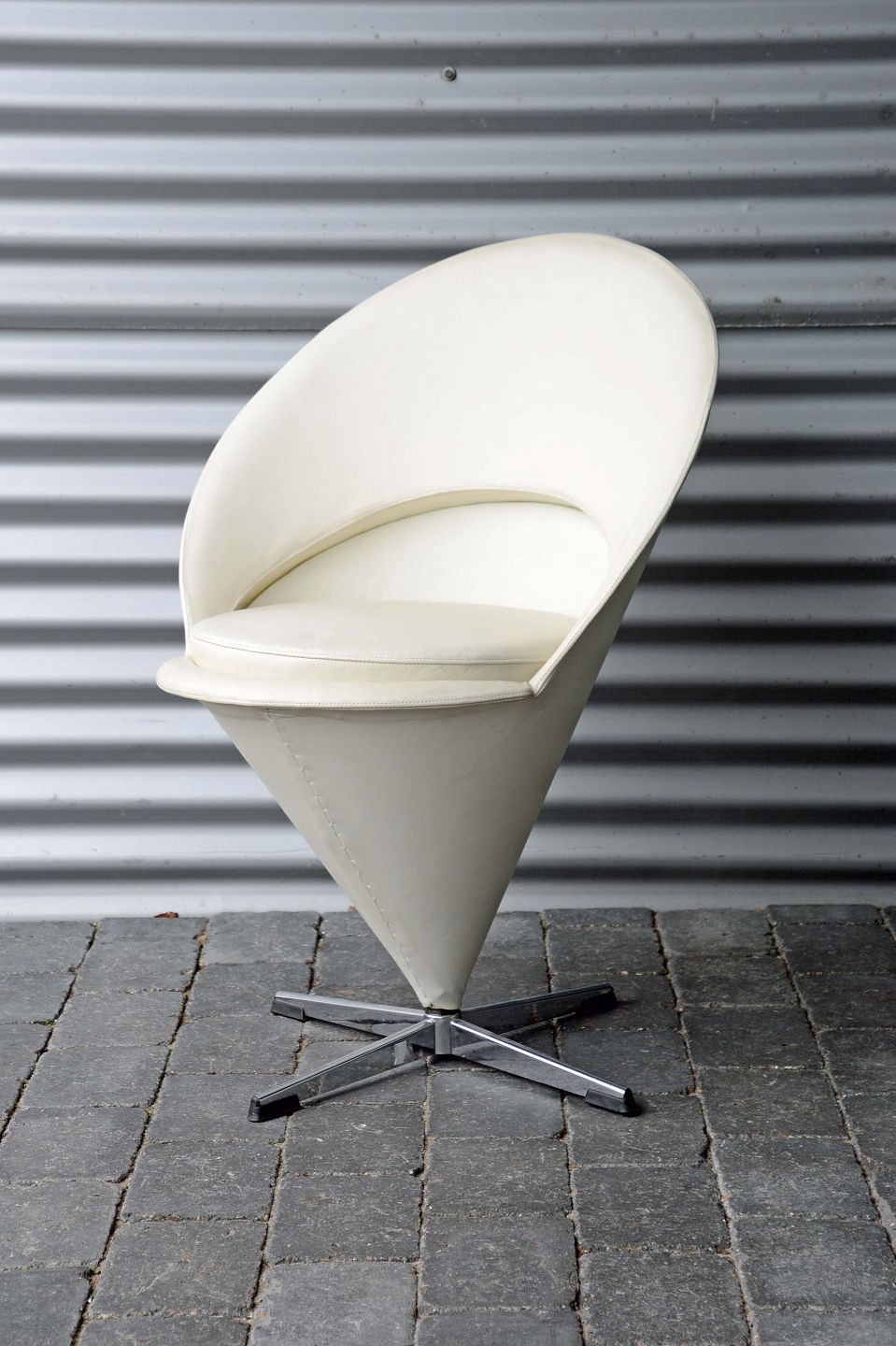 Kræmmerhus stol designet af Verner Panton. Cone stolen er betrukket med lyst læder. Intakt læder. Kræmmerhuset fremstår med minimale brugsspor.