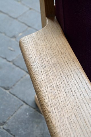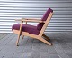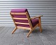 Lav lænestol model GE 290 i eg designet af Hans J. Wegner. Den viste stol er solgt, men vi har med andet stof i butikken.