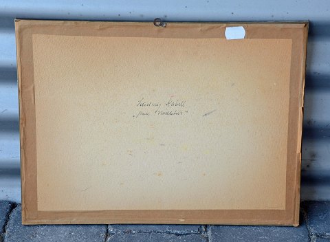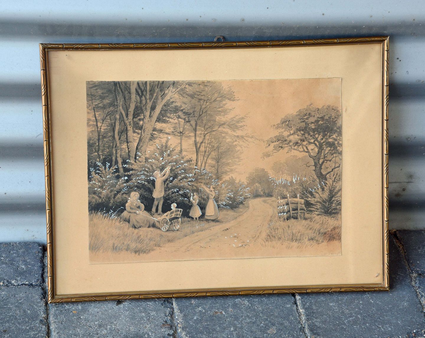 Tegnet og malet billede med overskriften "På nøddetur" af Ludvig Kabell (1853-1902). Signeret. Lidt brugsspor på rammen.