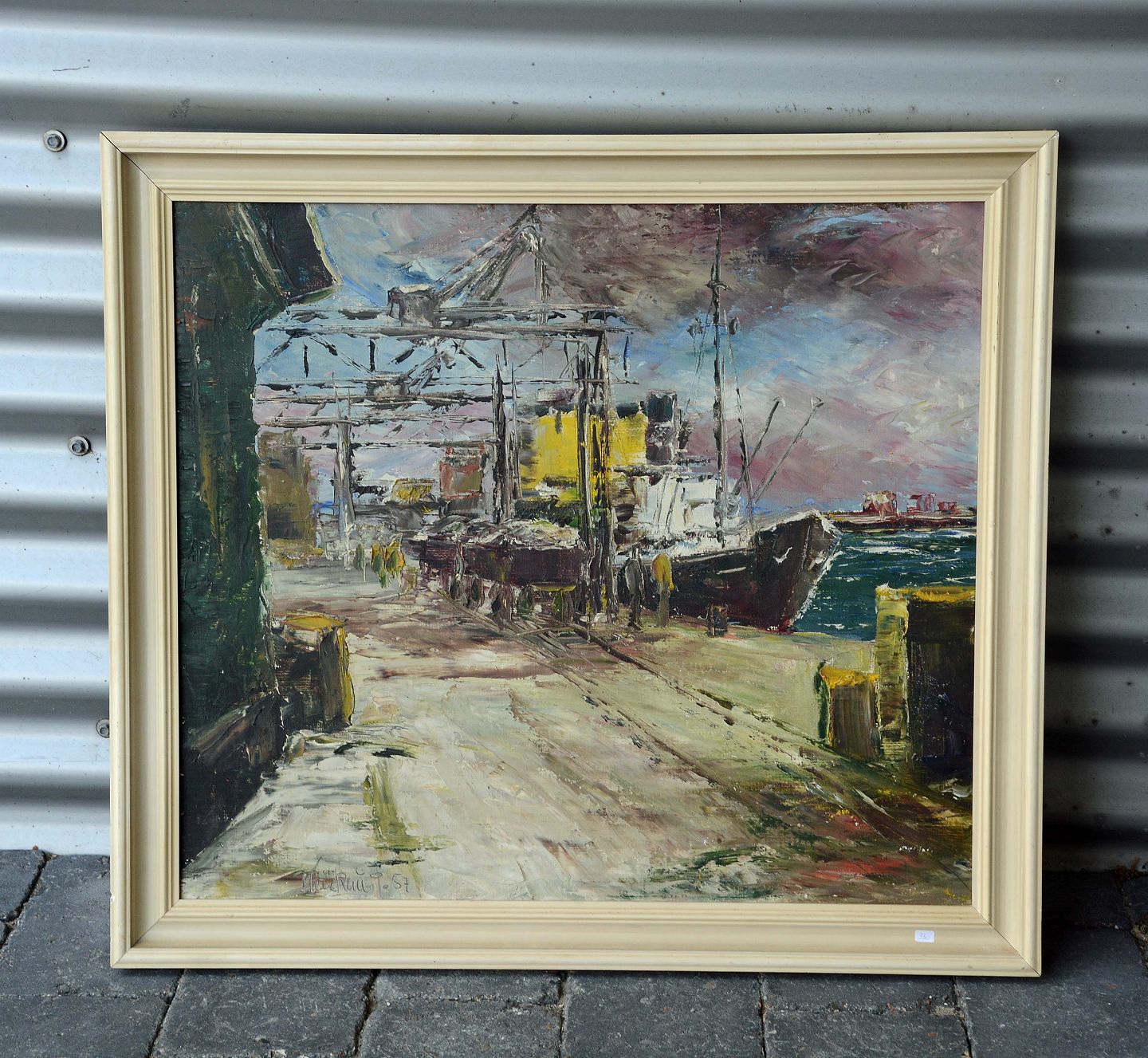 Maleri på lærred med motiv af skibe i havn. Maleriet er fra 1957 og signeret af Kai Rau. 1891-1957