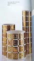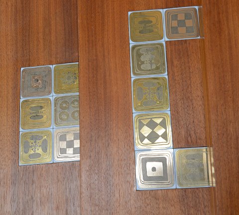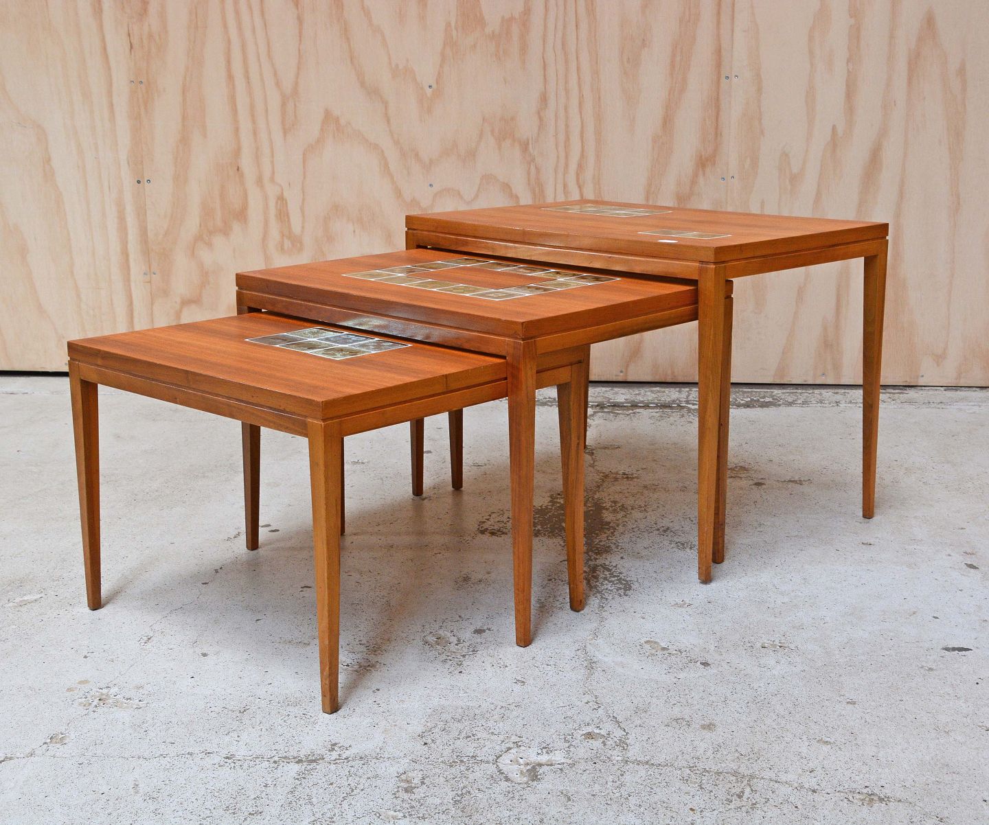 Et sæt Indskudsborde i teaktræ med gyldne kakler med forskellige motiver designer af Bjørn Wiinblad. Kaklerne på bordet er en del af i serien "Quatre Couleurs". Fremstår med meget få brugsspor - ridser.