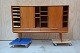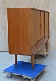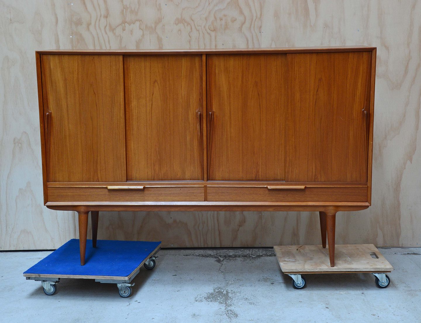 Omann Junior skænk i teaktræ med to skuffer, fire skydelåger og indvendigt seks udtræksbakker og hylder. Skænken/dækketøjsskab fremstår med enkelte brugsspor - ridser.