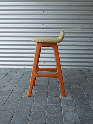 Lakeret teak skammel/barstol med polstret stofbetrukket sæde og stel i teaktræ.