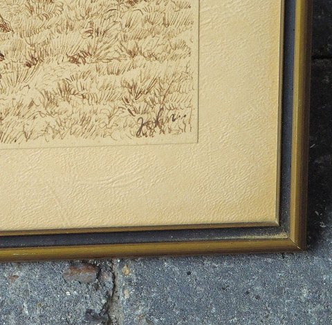 Indrammet tegning af naturområde med sti. Signeret John. B. Johannesen. Fremstår med brugsspor på rammen og intakt glas.
