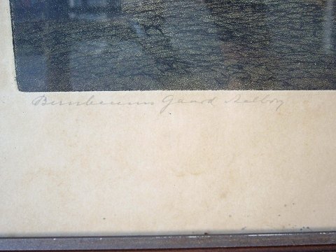 Indrammet Aalborgensirsk motiv af Hans Aalbo med motiv af hus med stengårdmiljø