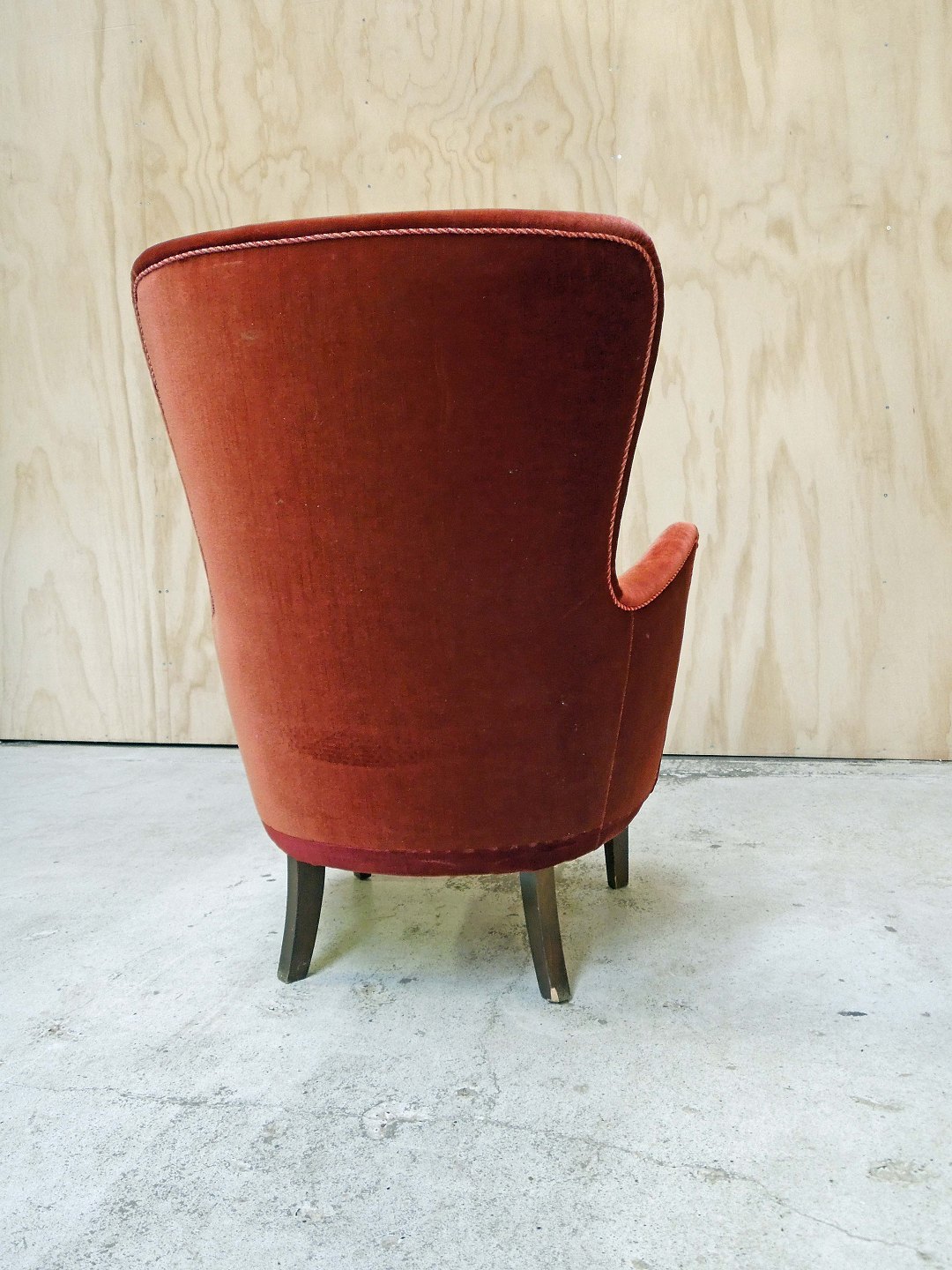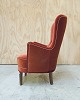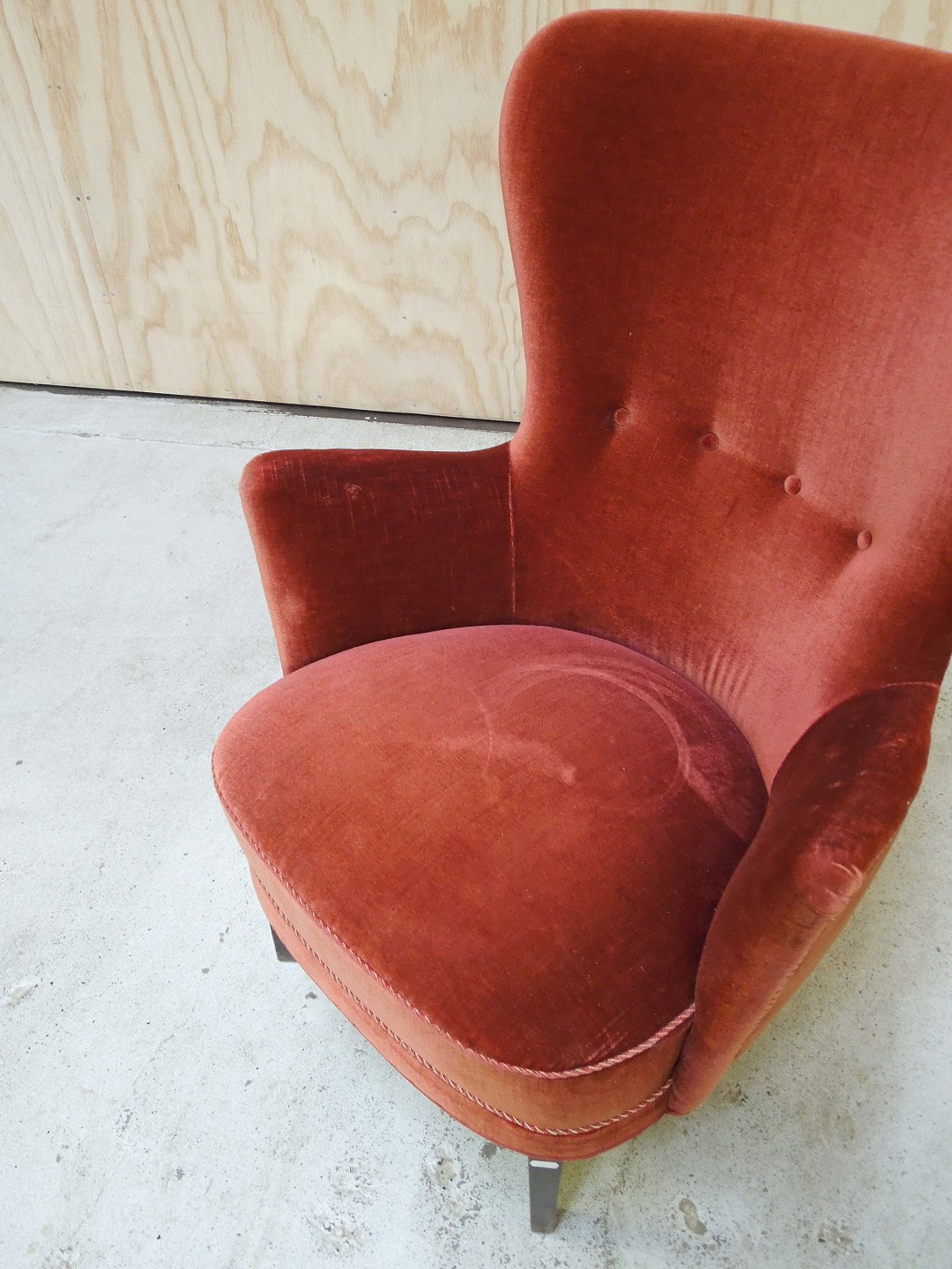 Lænestol betrukket med rødt velourstof. Fremstår med brugsspor på ben og sæde.