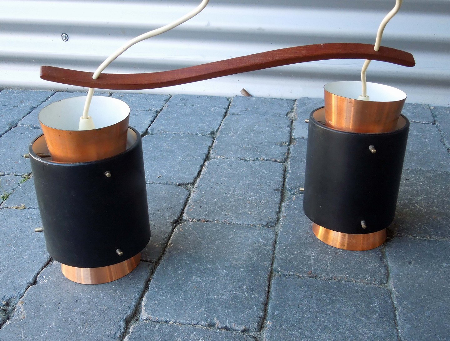 2 loftslamper på teak bøjle. skærme i sortlakeret og kobber-lakeret aluminium skærm.