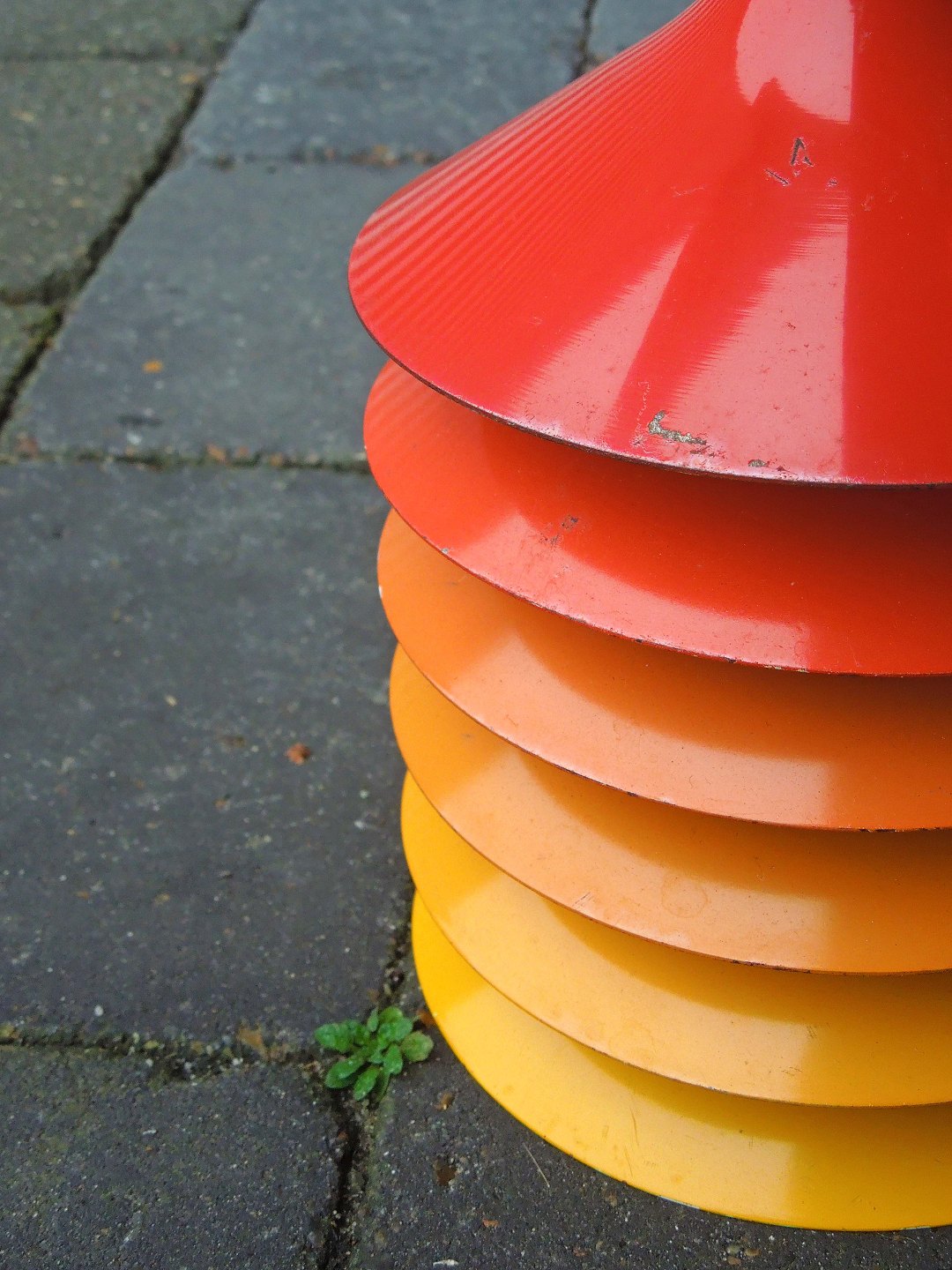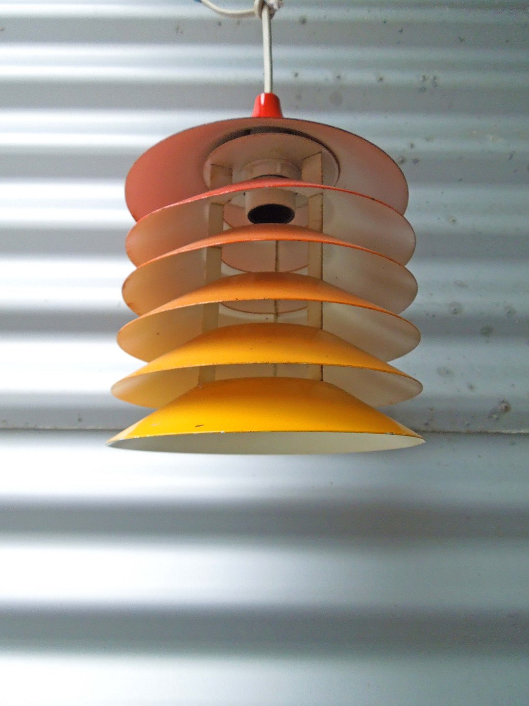 Loftslampe. Duett pendel designet af Bent Boysen for Ikea i 1970érne med farvet metalskærm i gul, orange og rødlige farver og hvidmalet på undersiden. Fremstår med brugsspor og små rustpletter.