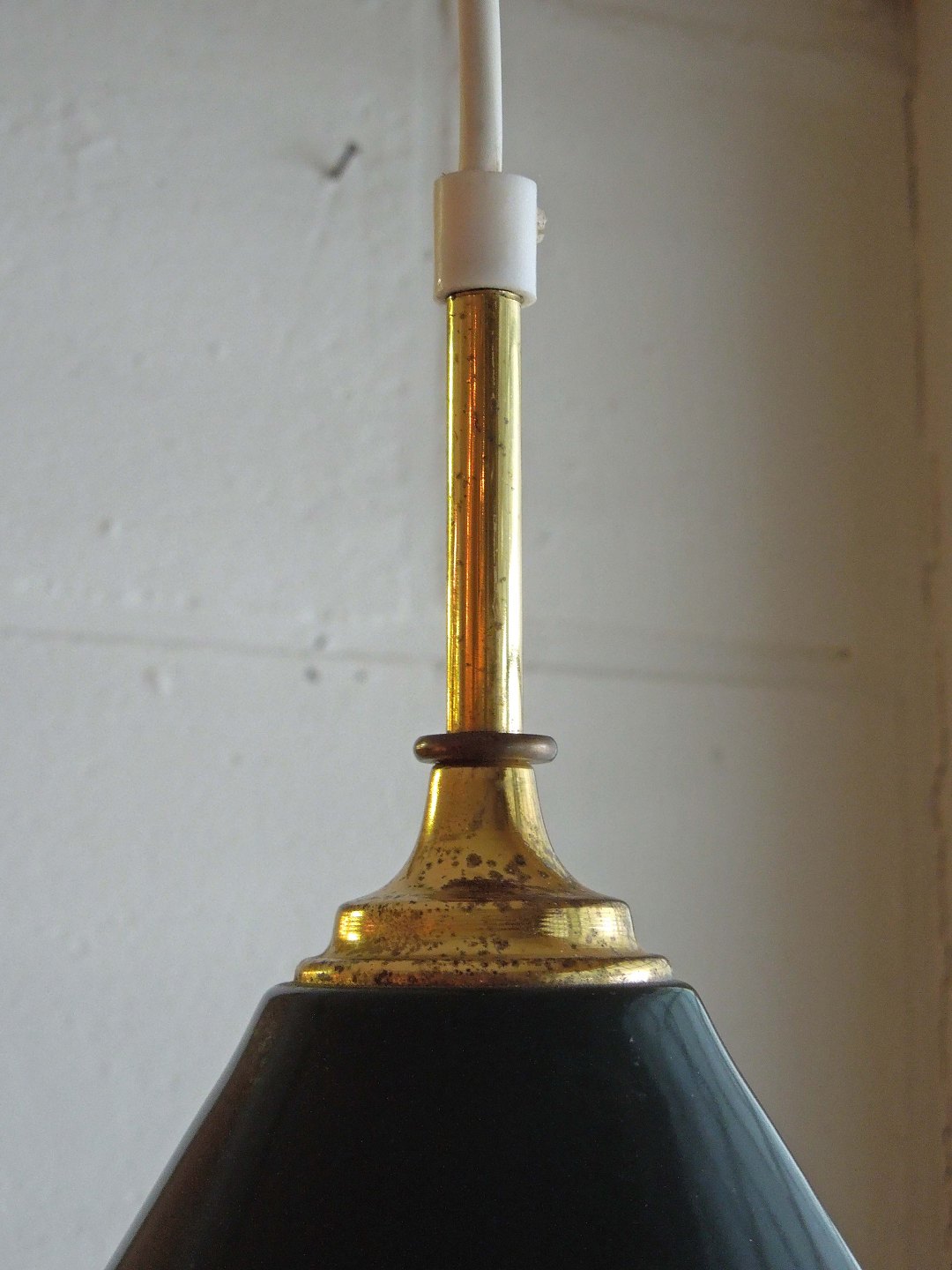Loftslampe i grøn emalje med messing top.